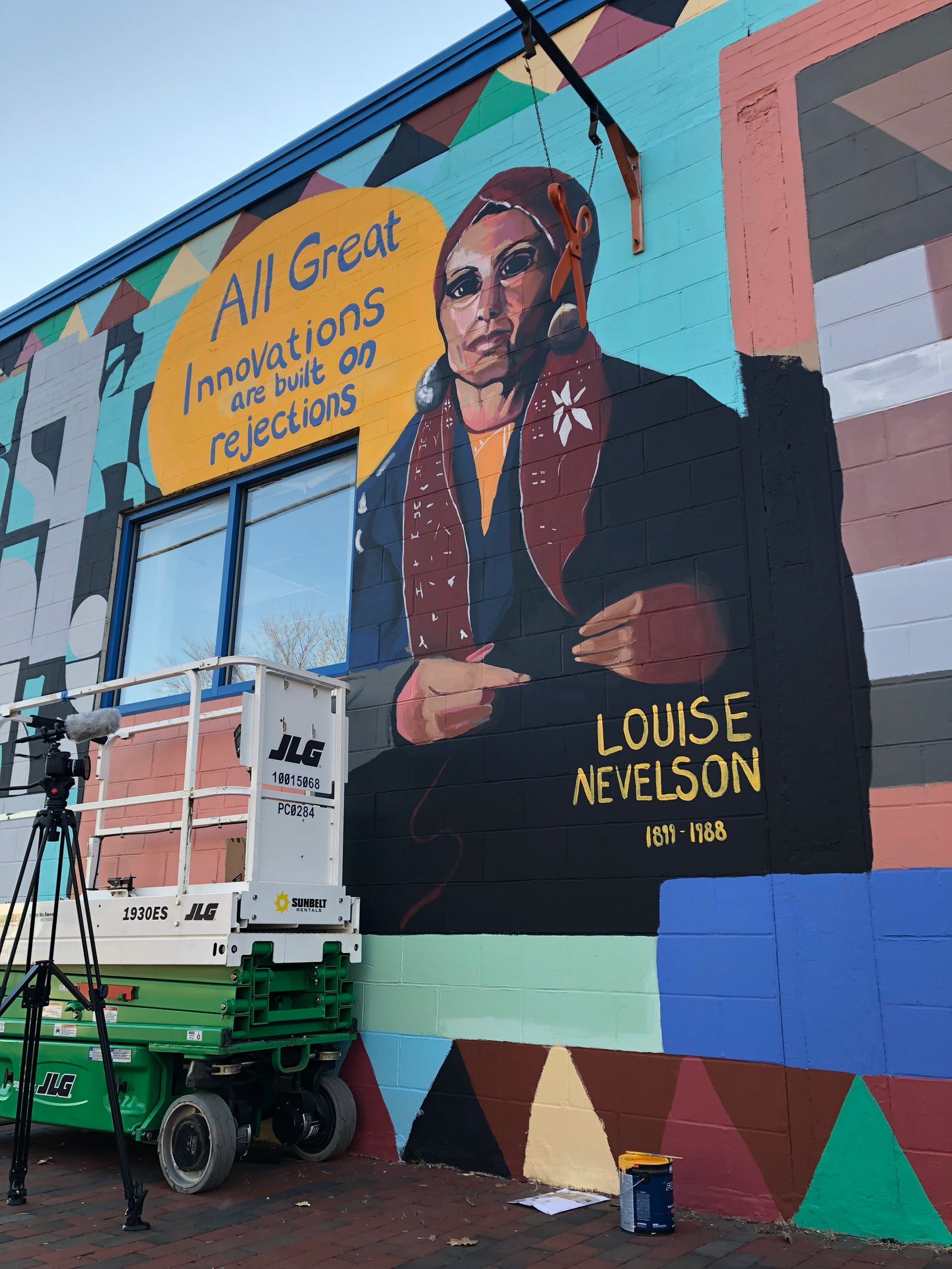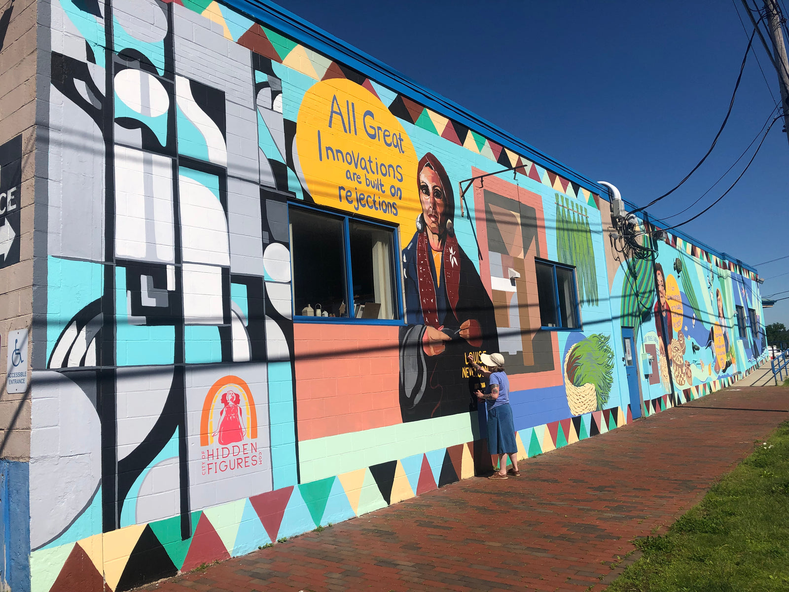 A mural celebrating three of Maine's Women Artists- Sculptor Louise Nevelson, Basket Maker Mary Mithcell Gabriel, and illustrator Dahlov Ipcar. This mural is on the exterior wall of Artist Studios Running withScissors in Portland, Maine. Abigail Painted this mural as the inaugural Mural for her non profit "City of Hidden Figures" which seeks to provide public art opportunities to women artists, while often celebrating local "Hidden Figures".