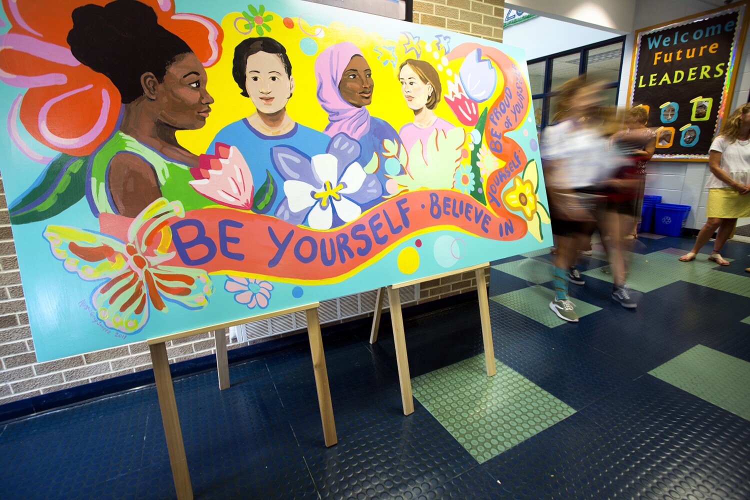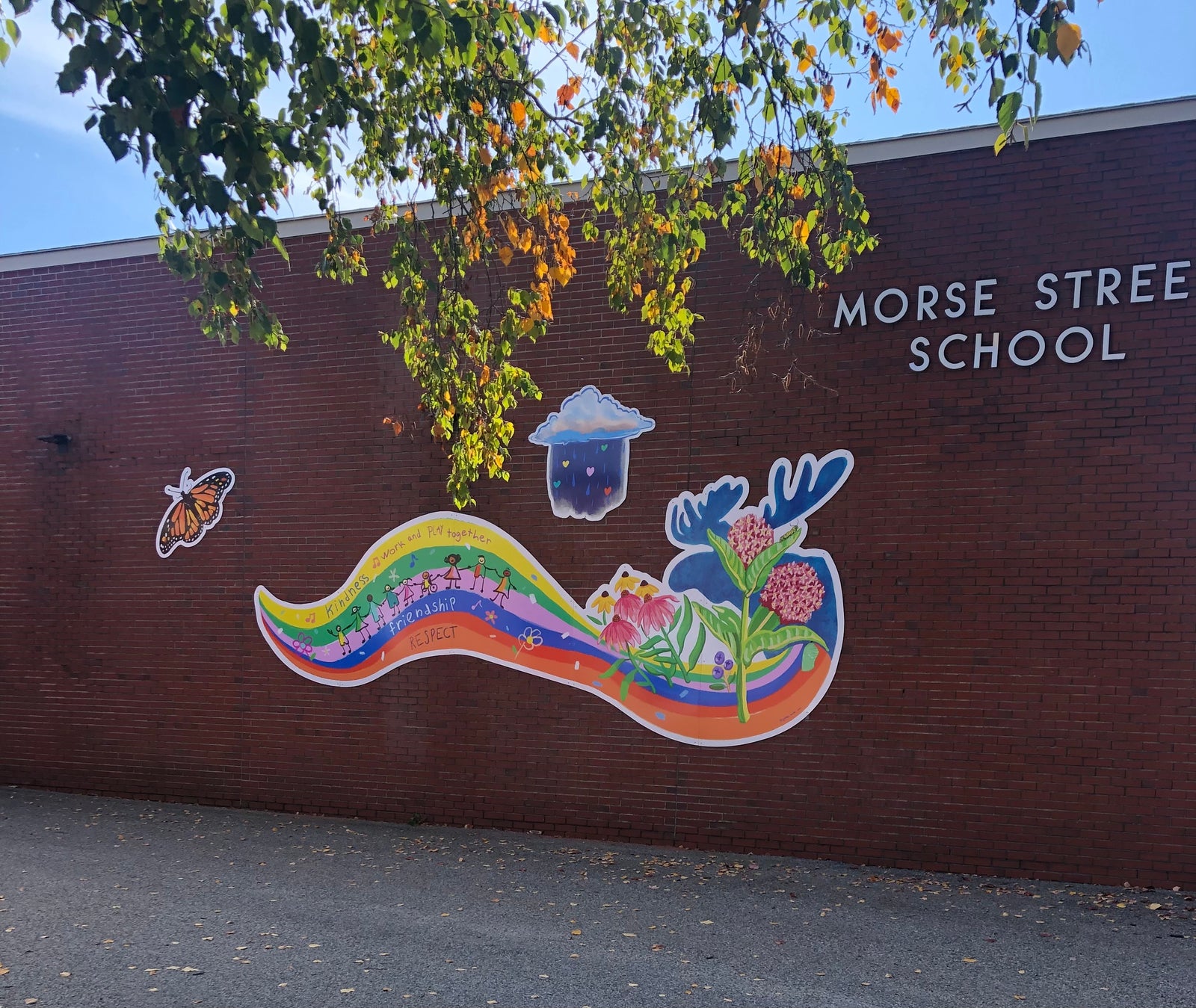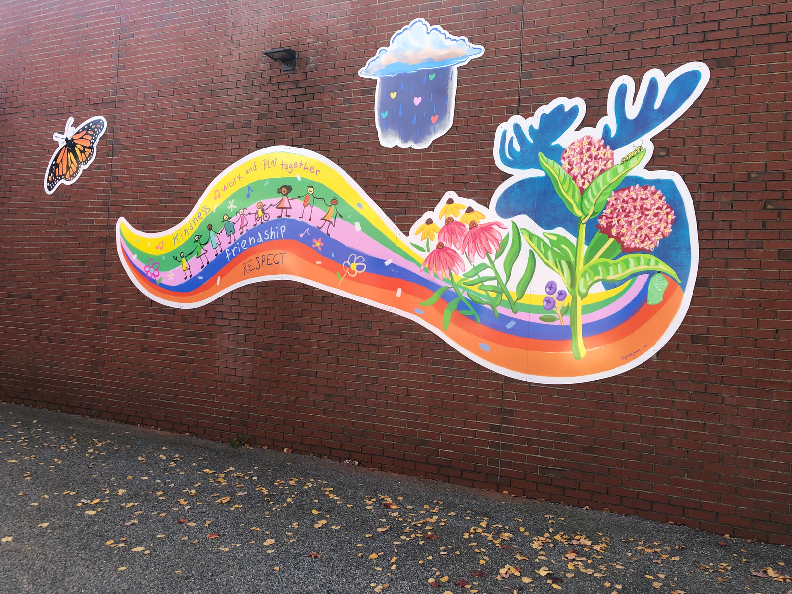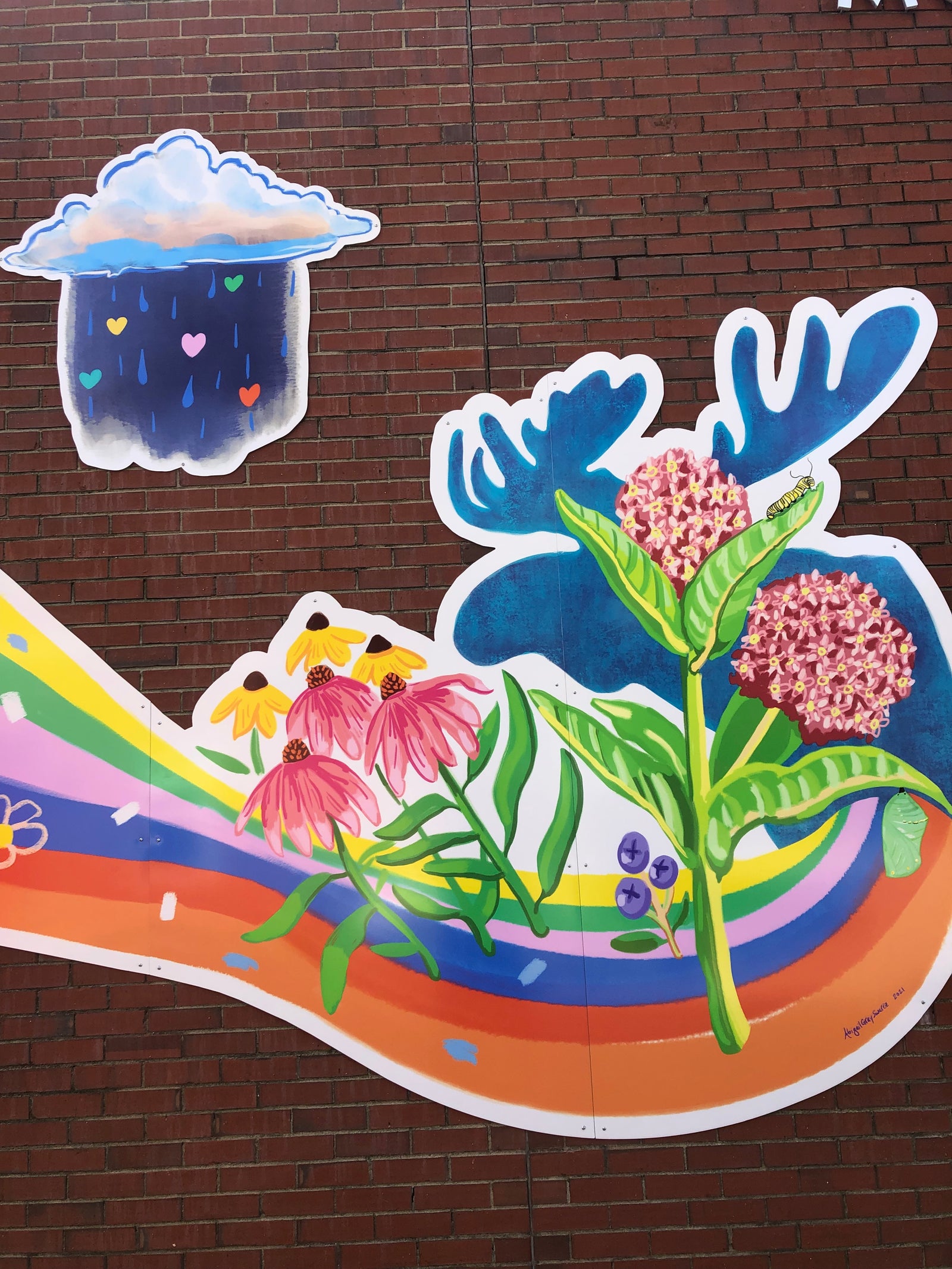 Abigail was commissioned in the spring of 2021 to make a mural for Morse St elementary school in Freeport, Maine. She took elements and themes from student artwork and lists of their favorite things, including the school's mascot, and the school's values and incorporated them into a design. The art was printed on panels and installed in October 2021.